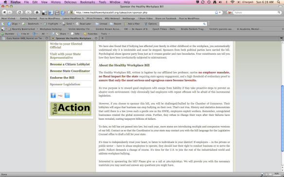Perhaps its time the mainstream media starts looking at what’s actually in this pending legislation. Advocates for the law, written by the Vice President of the non-profit Workplace Bullying Institute (WBI), often say that the Healthy Workplace Bill is business friendly. With all due respect to the WBI for the groundbreaking work they began a decade ago, their website campaign woos legislators and opts to appease critics by calling their own bill “such a gentle one” and saying that “Its true purpose is to reward good employers to escape from liability if they take proactive steps to prevent an abusive work environment.” [see snapshot below]