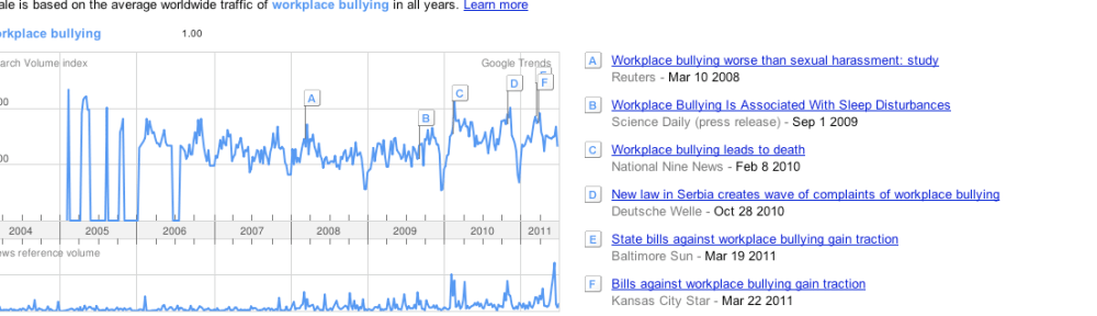 Which corner of the world googles the phrase “workplace bullying” the most? Well Australia and Ireland seem pretty matched in the number 1 & 2 spots — which given the disparity of size of the two countries says something for the plight of the Irish worker. New Zealand isn’t far behind. And, the UK, Canada and the US follow showing the least interest.