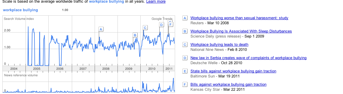Which corner of the world googles the phrase “workplace bullying” the most? Well Australia and Ireland seem pretty matched in the number 1 & 2 spots — which given the disparity of size of the two countries says something for the plight of the Irish worker. New Zealand isn’t far behind. And, the UK, Canada and the US follow showing the least interest.