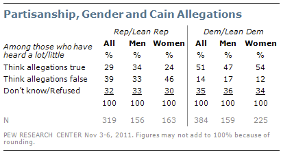 This week the Pew Research Center released a survey showing that 4 in 10 Americans feel the sexual harassment claims against Herman Cain are true and that, on balance, media coverage has been fair. It’s hard to imagine any issue in today’s hotly political climate that doesn’t change when looked at in terms of party. So, not surprisingly Pew found that Democrats are far more likely to believe the allegations. Here’s where it gets weird. Cain remains in the news for condescendingly swiping at Speaker Pelosi with the label “Princess” and reportedly making jokes about whether Anita Hill would support him. Even the NY Daily News pointedly reported: Herman Cain, GOP presidential hopeful accused of sexual harassment, frequent defense: It was a ‘joke.’ At first glance it would appear that Cain is insensitive to the feelings of those Republican women who choose to follow him. However, he may actually be playing to his crowd. The really interesting numbers in the Pew Survey pop out when it’s broken down by both partisanship & gender. Check out the table below.
